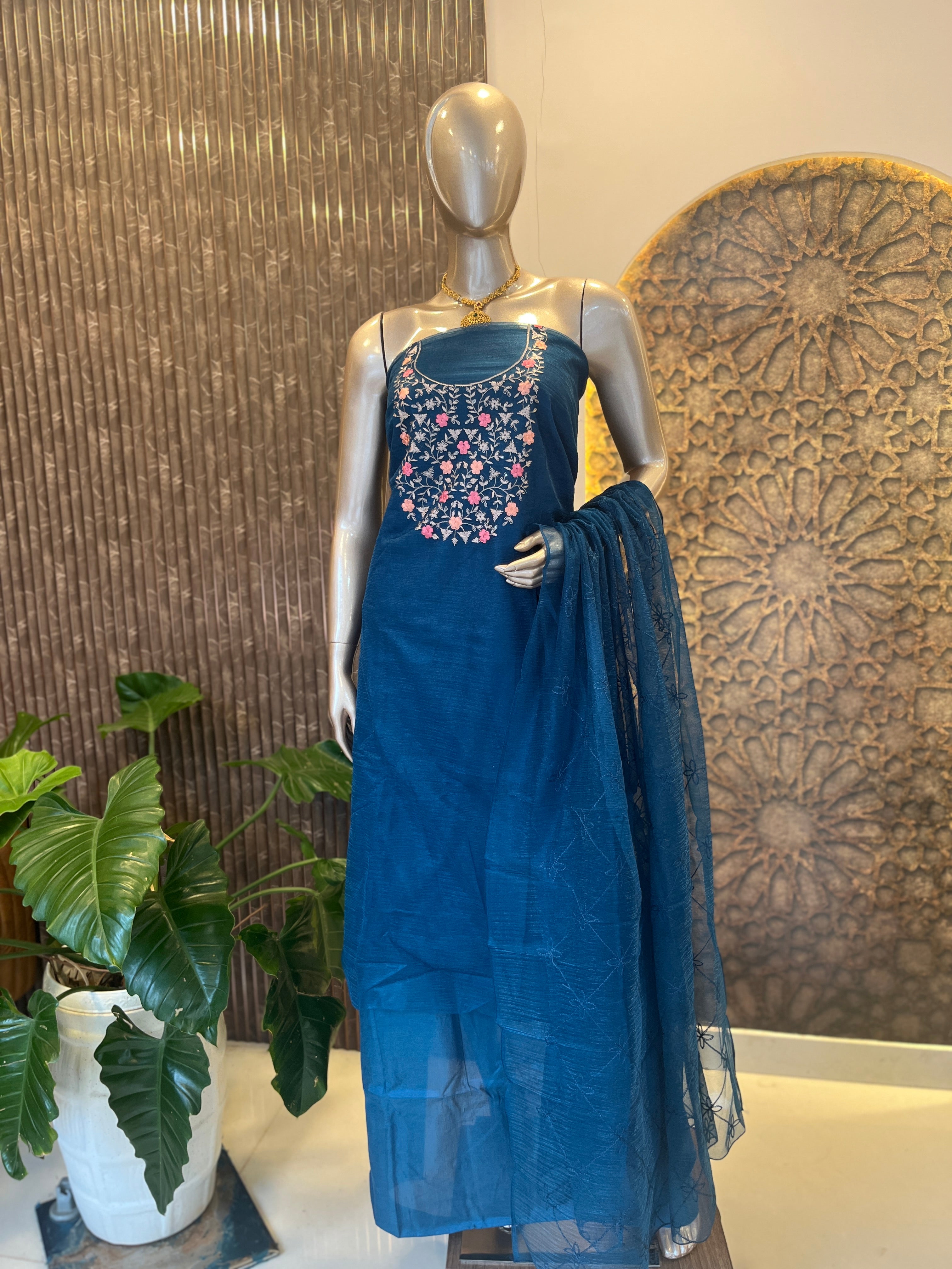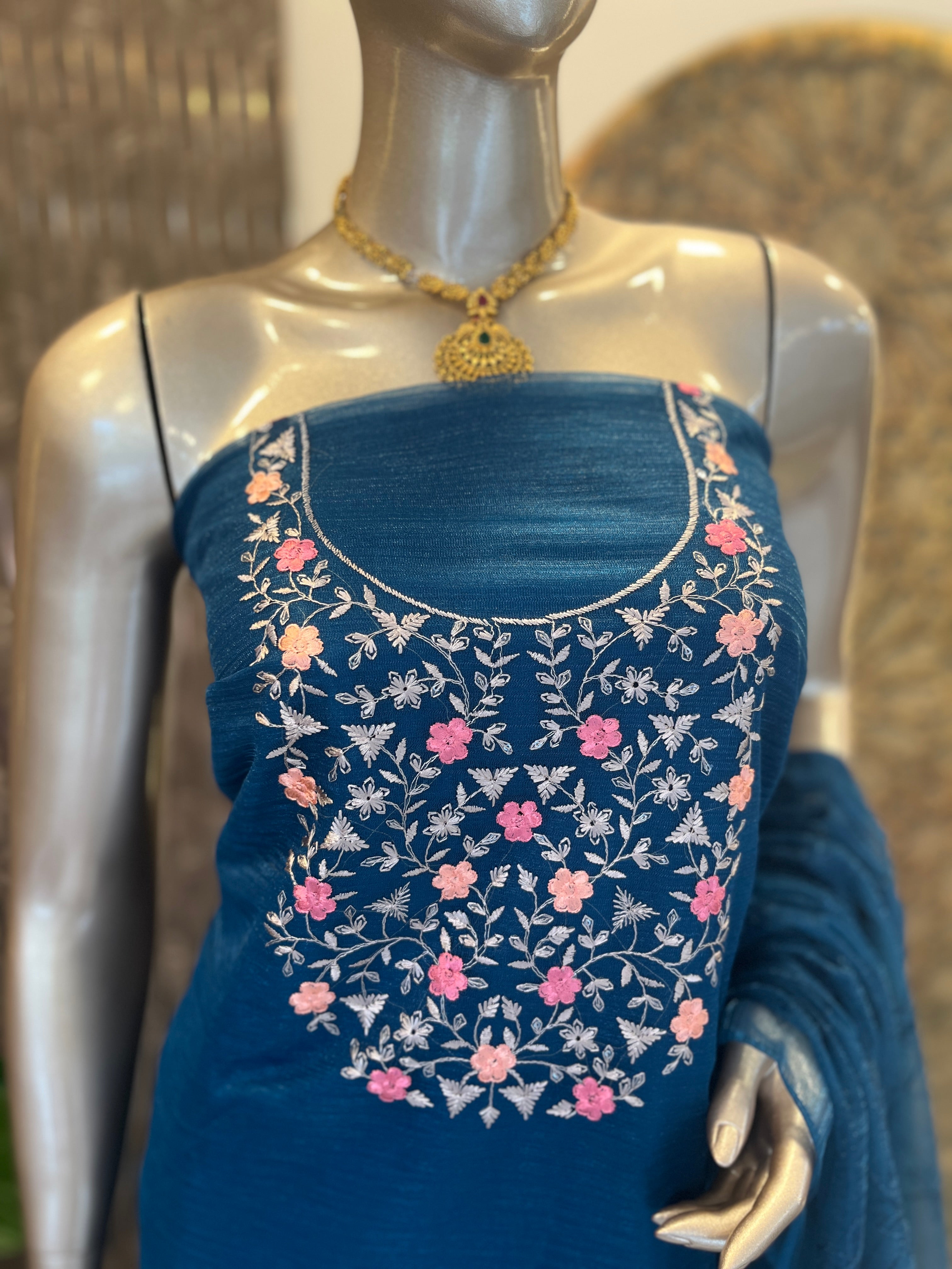 Budget friendly Unstitched tissue net Salwar Material neck embroidery work bottom plain Dupatta lines embroidery work