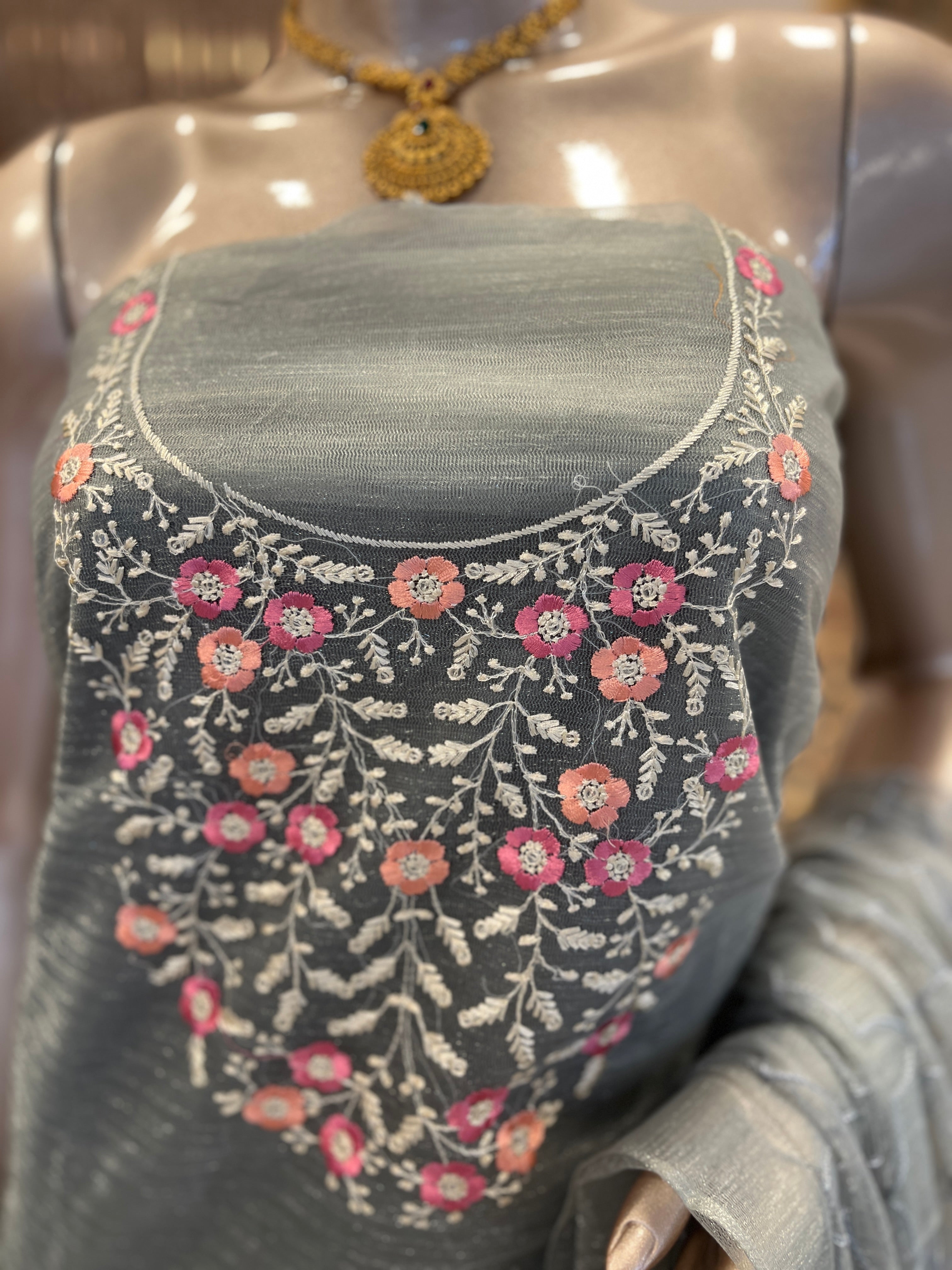 Budget friendly Unstitched tissue net Salwar Material neck embroidery work bottom plain Dupatta lines embroidery work