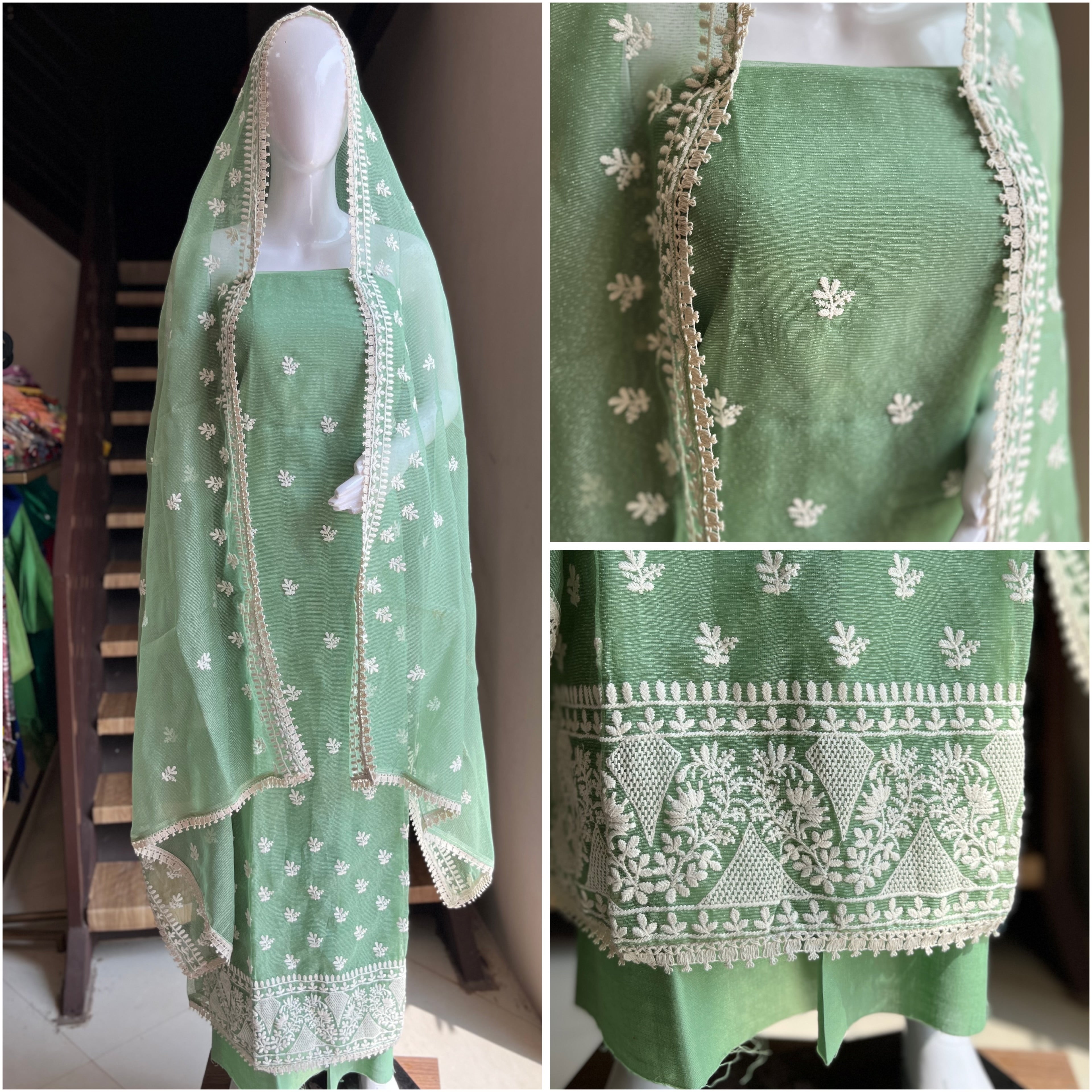 Unstitched net cotta Salwar Materials with lining. Top simple embroidery work .bottom plain .Dupatta four side embroidery work .