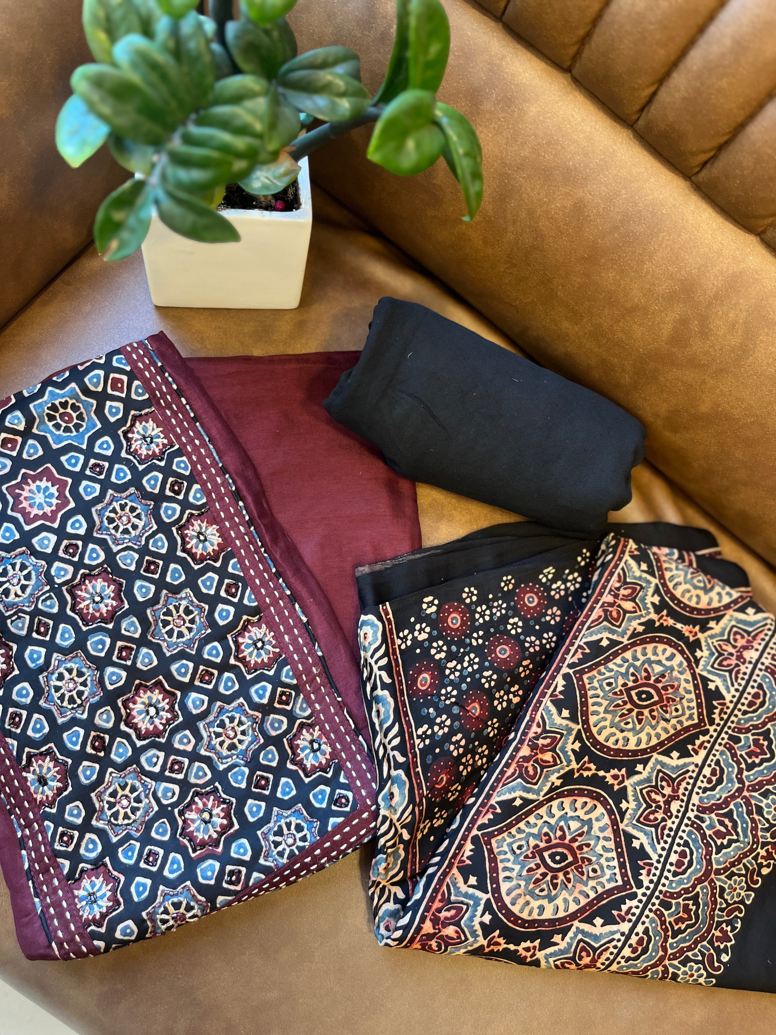 Unstitched plain dolla silk Salwar Material .neck Ajrak patchwork with embroidery work . Bottom plain . Dupatta ajrak print